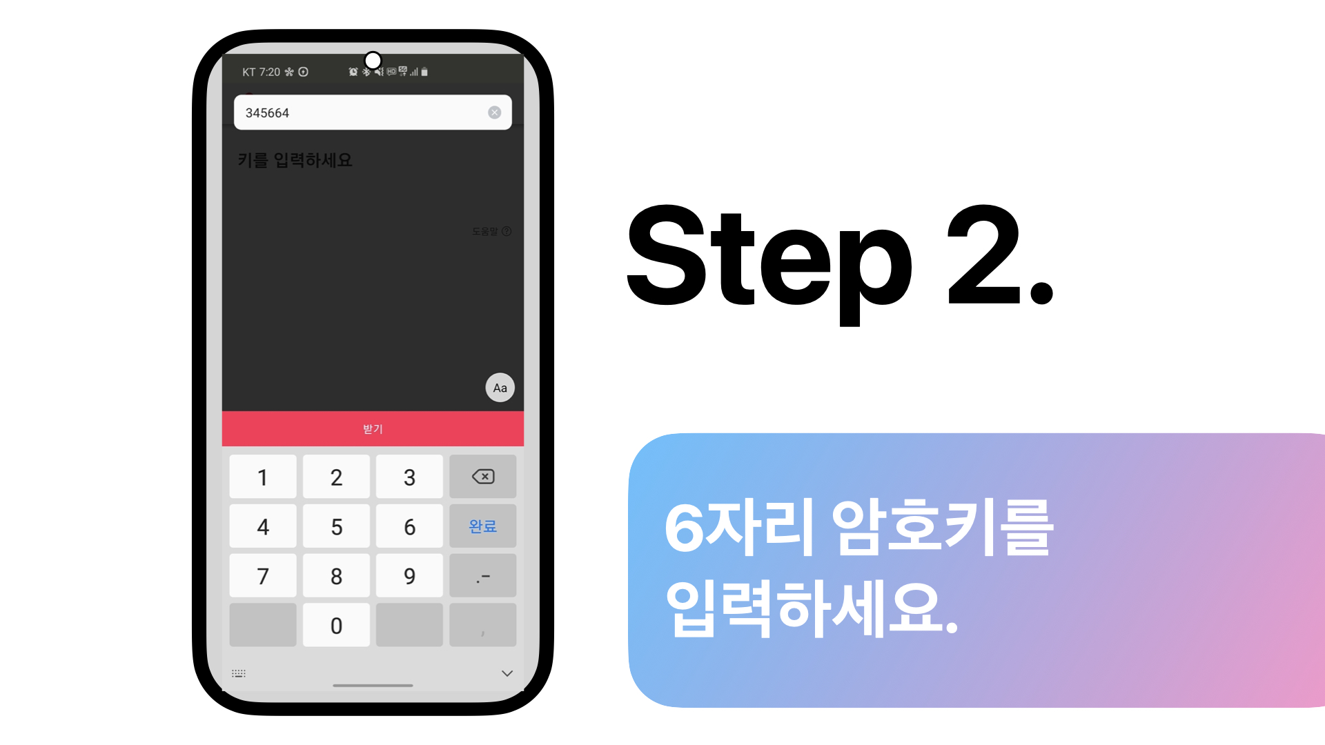 받기 탭을 선택한 후, 6자리 암호키를 입력하세요.