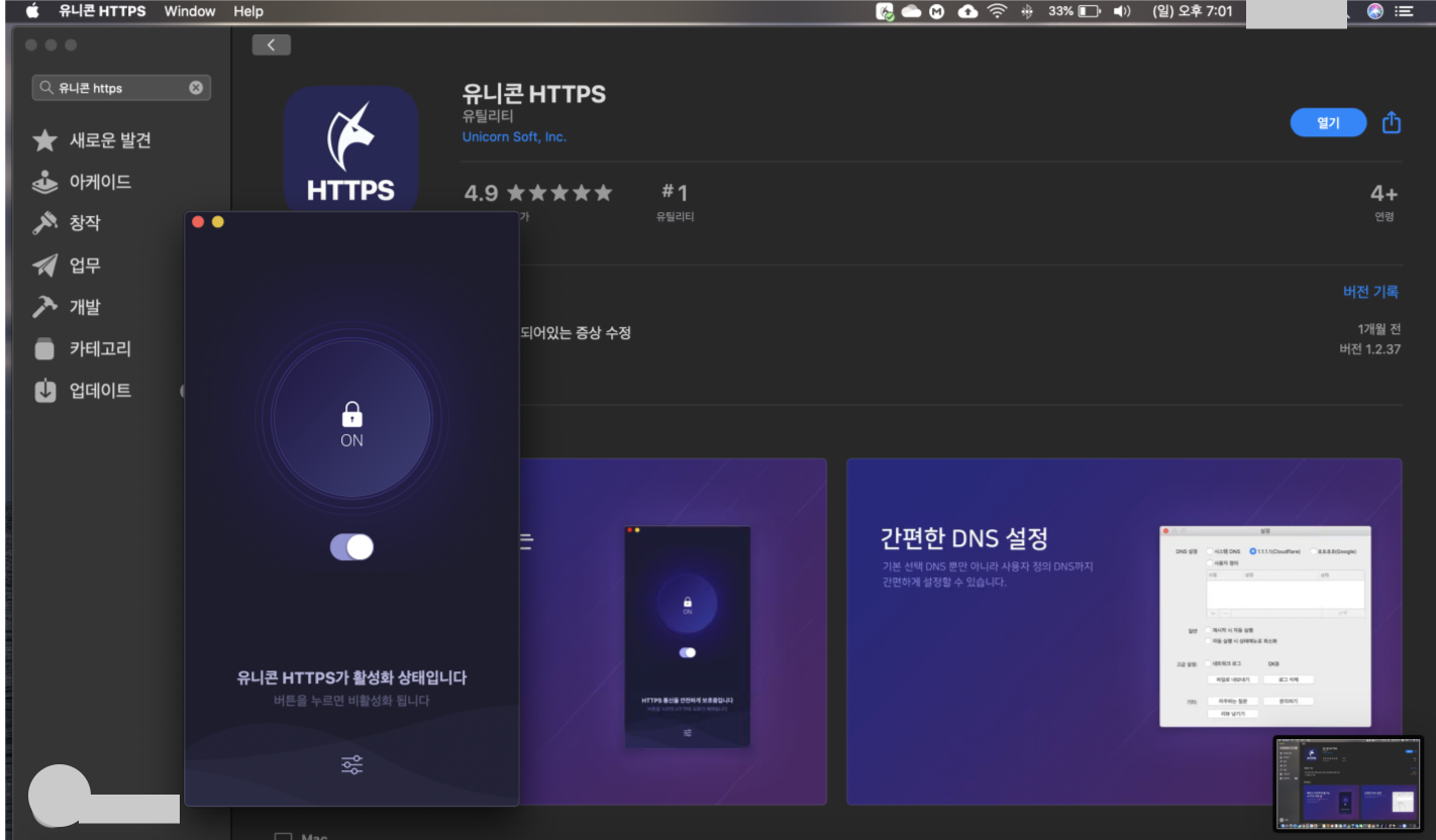 실행한 모습입니다. 정말 간단한데요. 유니콘 https 앱을 열고 스위치만 눌러주시면 됩니다.
