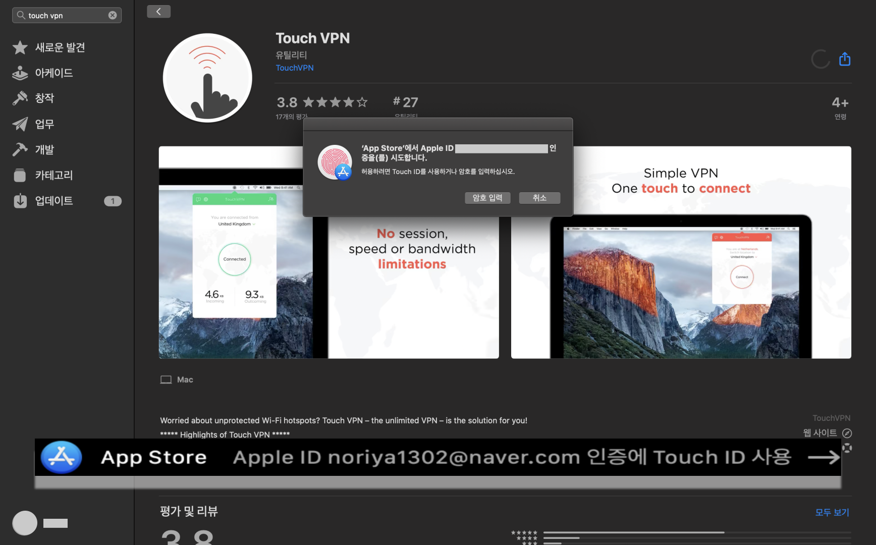 여기서 본인의 Apple ID or Touch ID로 지문 인증해주시고 설치해주시면 됩니다.