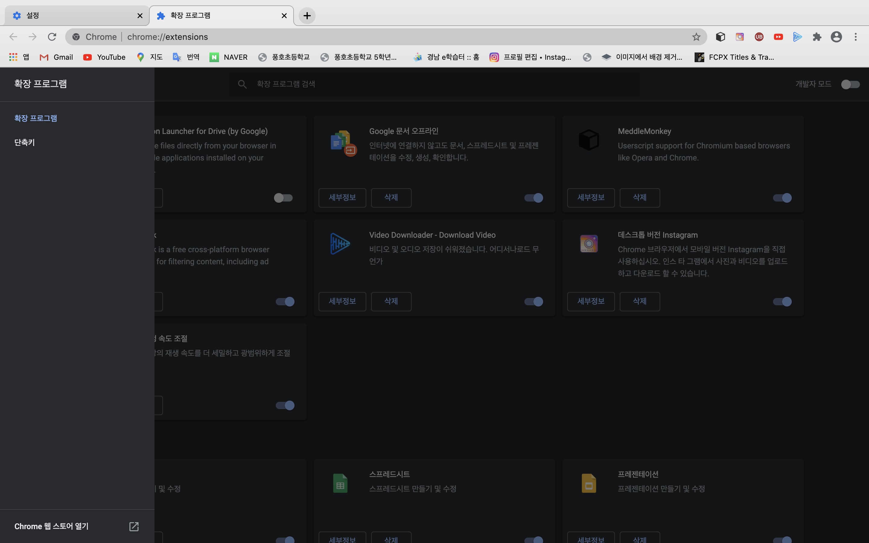확장 프로그램을 누르면 아마 이런 식으로 자기가 설치한 확장 프로그램이나 아니면 설치를 한 번도 안 해보셨다면 아무런 화면도 없을 겁니다.
