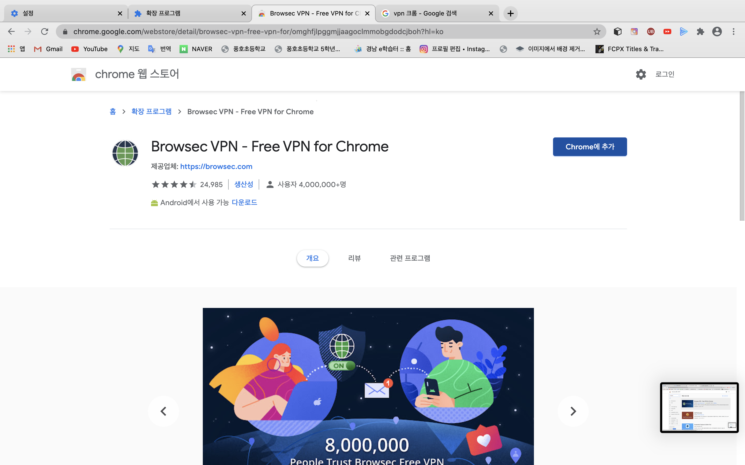검색하면 이런 화면이 뜰 건데요. 여기서 Browsec VPN이라고 적혀있는 곳을 클릭해줍니다.